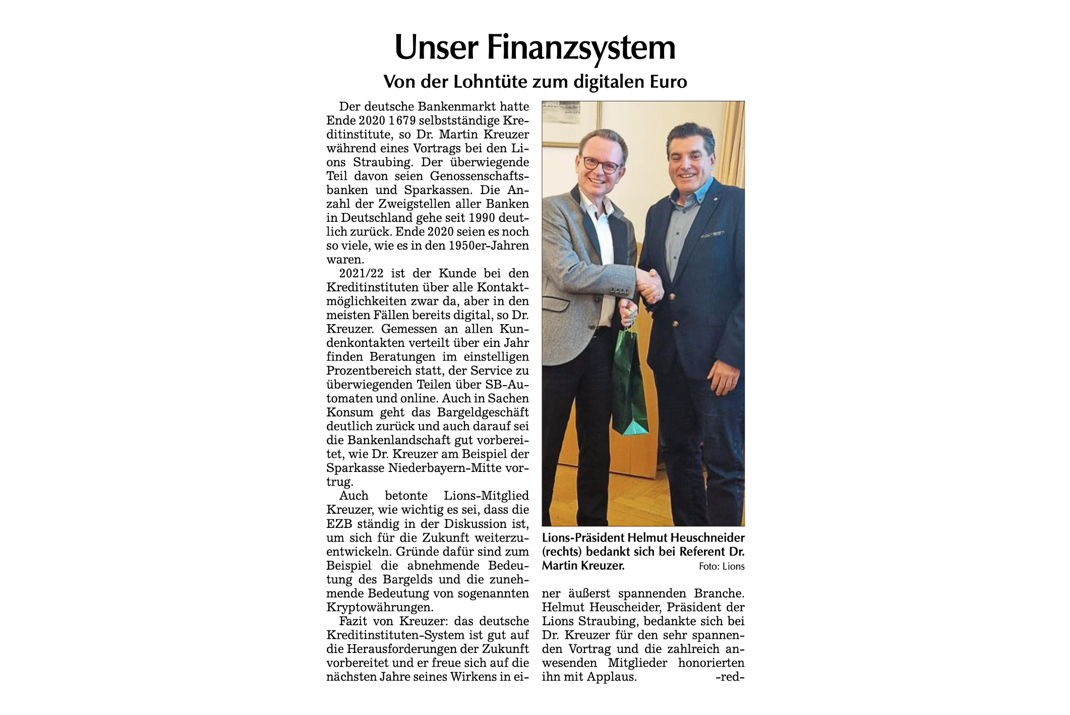 Lions-Freund und stellvertrendender Vorstandsvorsitzender der Sparkasse, Dr. Martin Kreuzer referiert bei den Straubinger Lions über die Entwicklung des deutschen Finanz- und Kreditinstituten-System.